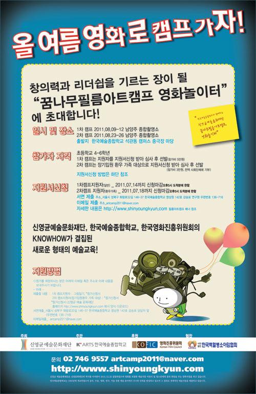 <²Þ³ª¹« Çʸ§ ¾ÆÆ® Ä·ÇÁ>´Â ¾î¸°À̵鿡°Ô ¿µÈ¿¡ ´ëÇÑ ²Þ°ú Ãë¹Ì¸¦ Àϱú¿ö ÁÖ´Â Áñ°Å¿î ÇÕ¼÷ ±³À° ÇÁ·Î±×·¥À¸·Î, 1Â÷(2011³â 8¿ù9ÀÏ-12ÀÏ), 2Â÷(8¿ù23ÀÏ-26ÀÏ)·Î ³ª´©¾î ½ÃÇàÇÑ´Ù. 1Â÷ Ä·ÇÁ´Â ÃʵîÇб³ 4-6ÇгâÀ» ´ë»óÀ¸·Î °ø°³¸ðÁýÇϸç, Âü°¡ Èñ¸ÁÀÚ´Â 7¿ù 20ÀÏ(¼ö) ±îÁö Âü°¡ ½Åû¼¿Í ±×¸²Àϱ⸦ Á¦ÃâÇÏ¸é µÈ´Ù. 2Â÷ Ä·ÇÁ´Â Àå±â ÀÔ¿ø ȯ¿ì °¡Á¤ÀÇ ¾î¸°À̸¦ ´ë»óÀ¸·Î, 7¿ù28ÀÏ(¸ñ)±îÁö Âü°¡ ½Åû¼¸¦ Á¦ÃâÇÏ¸é µÈ´Ù.